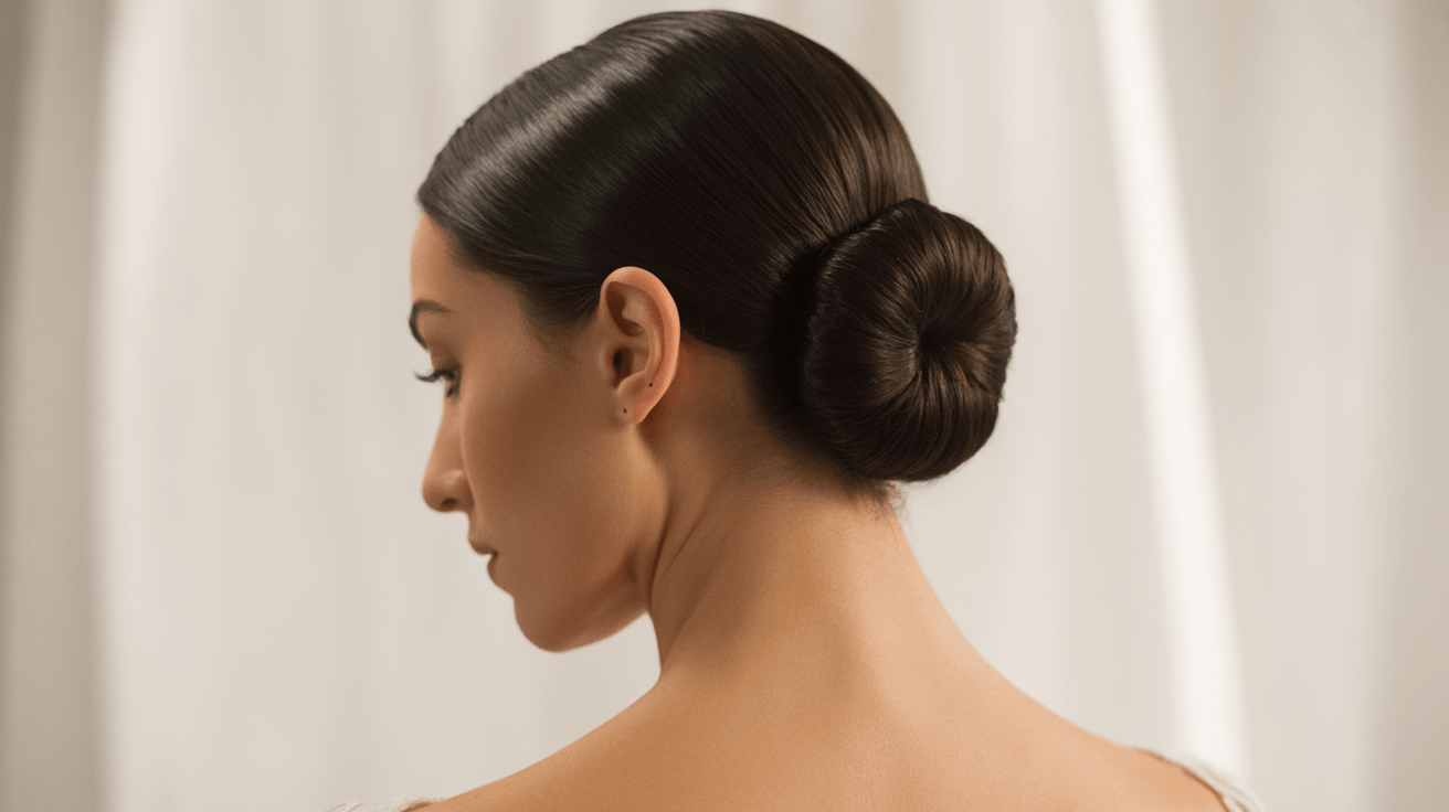 Styling tip: Use a bun donut form for a perfect, symmetrical shape. Wrap all hair over the form, pin edges thoroughly, and smooth with a boar bristle brush. Finish with strong-hold hairspray and a shine spray. The neater, the more expensive it looks.