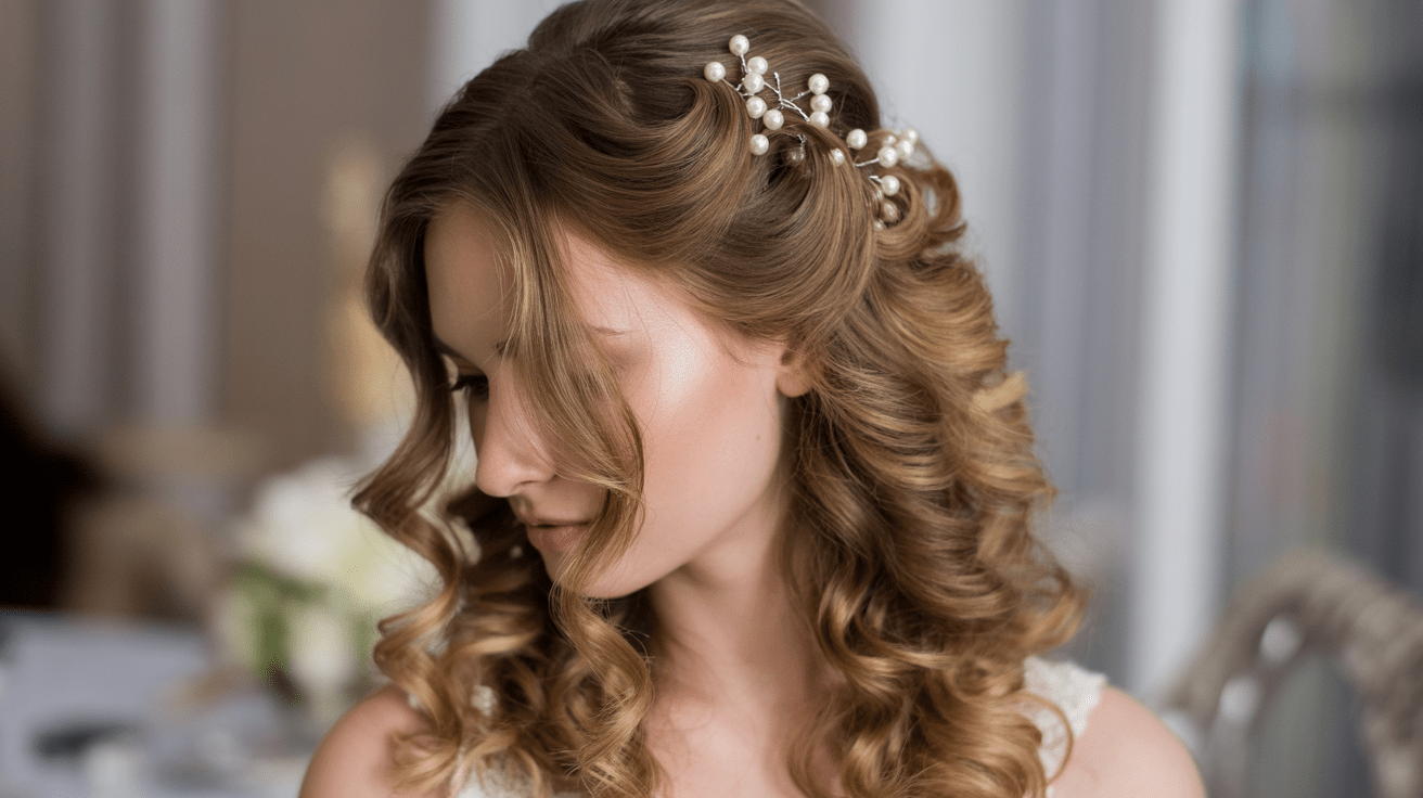 - Crystal or pearl headband — transforms simple waves or a half up into a fully bridal look