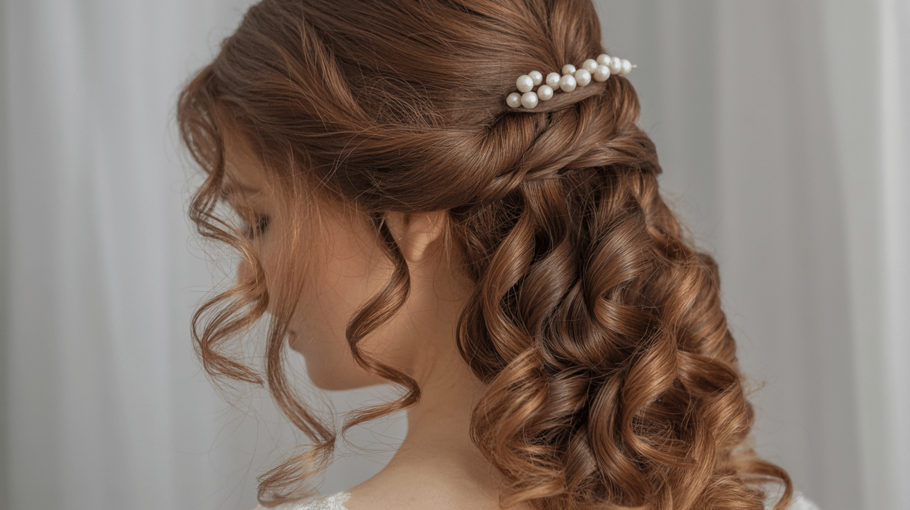 Styling tip: Section off the top third of your hair loosely — don’t pull it too tight. Secure with a decorative clip or clear elastic. Curl the remaining hair in generous sections and let them fall naturally. A few loose pieces around the face finish the look.