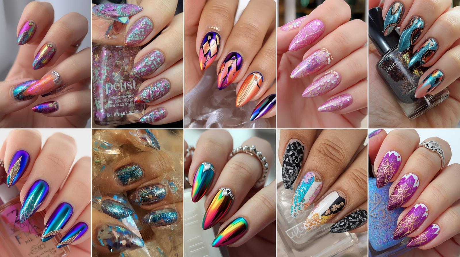 A holographic chrome powder that disperses rainbow light across the full spectrum as the viewing angle changes. Unlike silver chrome which reflects a single focused beam, holographic chrome creates a shifting rainbow effect — pink at one angle, green at another, gold from another. Under direct light or flash photography, holographic chrome nails are the most visually spectacular nail finish achievable. One of the most shared nail looks on TikTok and Pinterest globally in 2026.