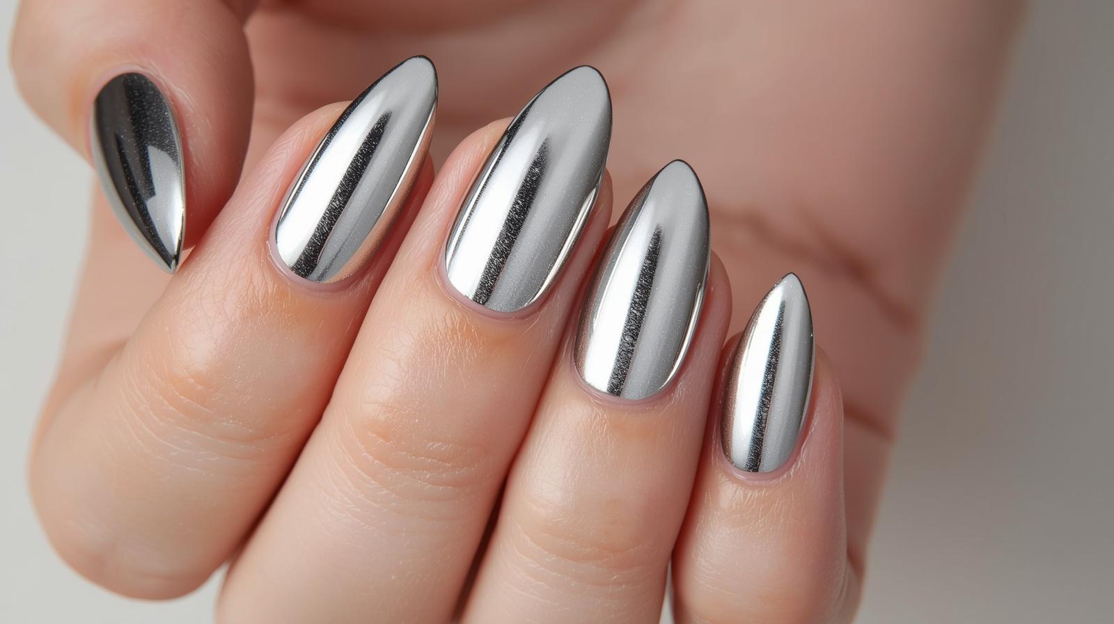 The almond nail shape is the most flattering for chrome finishes — the pointed, elongated silhouette amplifies the reflective quality of the chrome and creates a nail that looks like a piece of sculpted metalwork. Medium-length almond chrome in gold or silver is one of the most consistently impressive chrome nail looks in terms of overall elegance and visual impact.