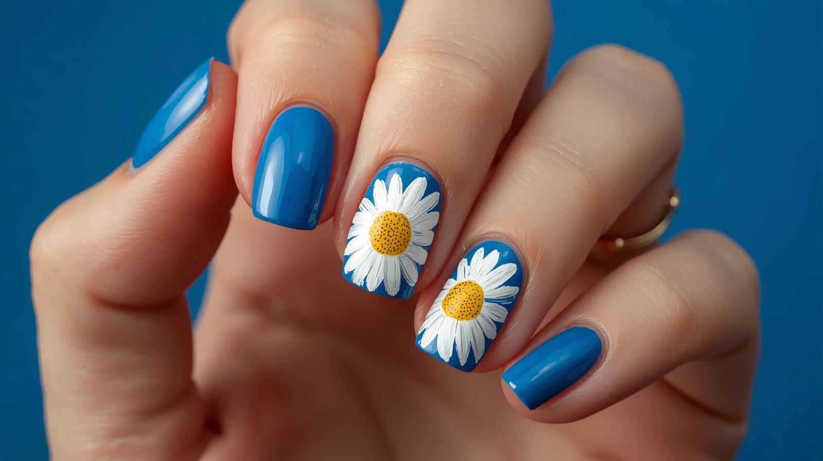 A high-contrast combination that looks bold and graphic — five white petals and a yellow center on a saturated cobalt blue base. The blue makes the white pop with an intensity that softer bases can’t replicate, and the result reads as both summery and fashion-forward. Particularly stunning on short square and short oval nails where the blue base is fully visible around the daisy design.
