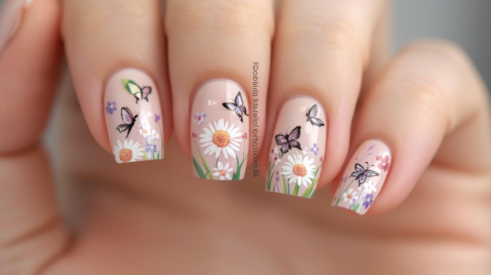 A hand-painted daisy on one accent nail paired with a delicate butterfly silhouette on the adjacent nail creates a complete garden scene without any single nail feeling overcrowded. The butterfly can be as simple as two open wing shapes in black outline, or as elaborate as a monarch butterfly in full amber and black detail. This combination is one of the most saved spring nail design ideas across Pinterest and TikTok nail communities in 2026.