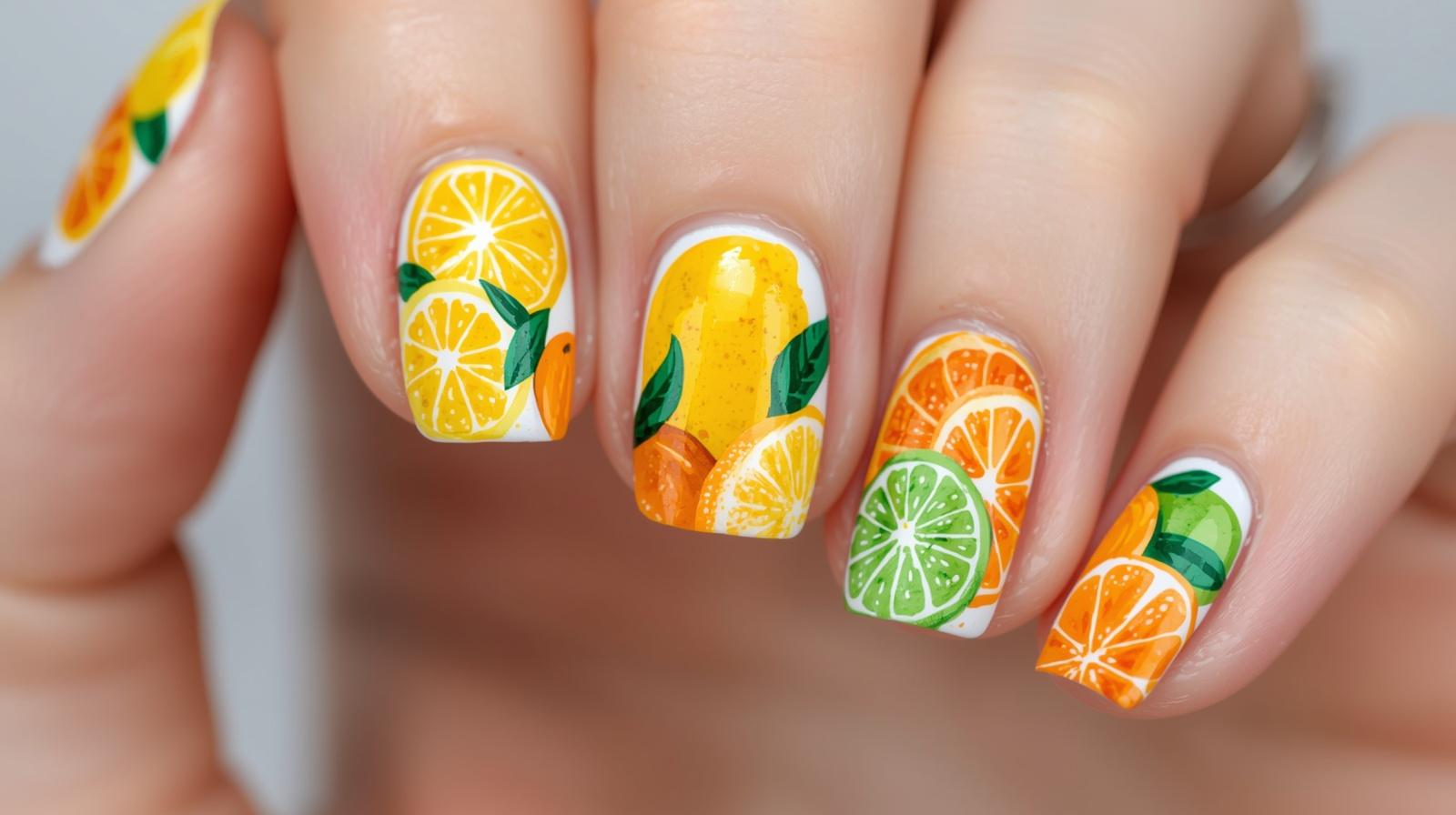 Each nail features a different citrus fruit — lemon on the thumb, orange on the index, lime on the middle, and so on. A playful, colorful take that gives you variety without committing to one motif. This design pairs naturally with the summer nail art ideas for short and medium nails — each fruit fits cleanly on shorter nail lengths.