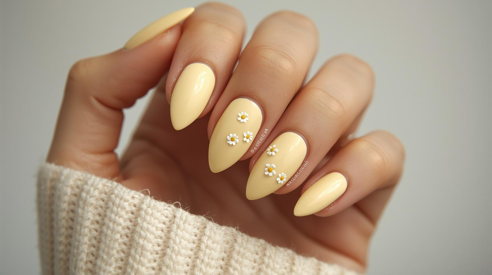 Butter yellow nails are having a serious comeback this spring, and adding a few tiny hand-painted daisies takes them from cute to utterly Pinterest-worthy. The warm yellow base is soft and almost pastel, making it the perfect canvas for white and orange daisy accents on one or two feature nails. Sweet, summery, and totally wearable.