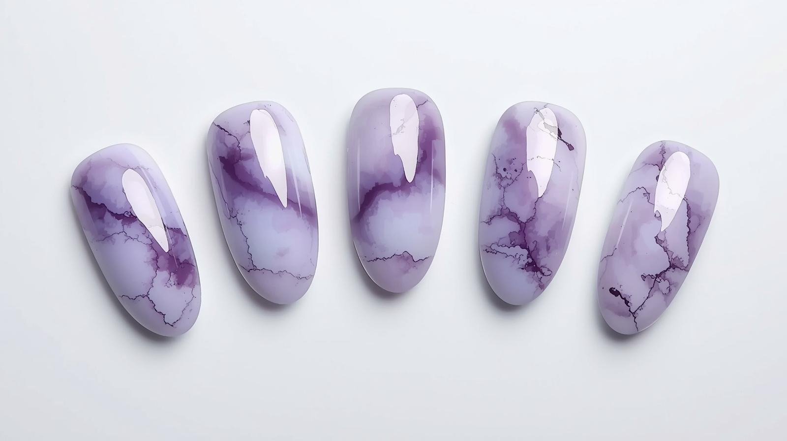 Soft lilac meets dreamy marble swirls in this design that looks incredibly complex but is totally achievable at home. The pastel purple base is layered with thin white and deeper violet swirls, creating a cloud-like, almost watercolor effect. Perfect for events, spring weddings, or anyone who wants their nails to feel like art.