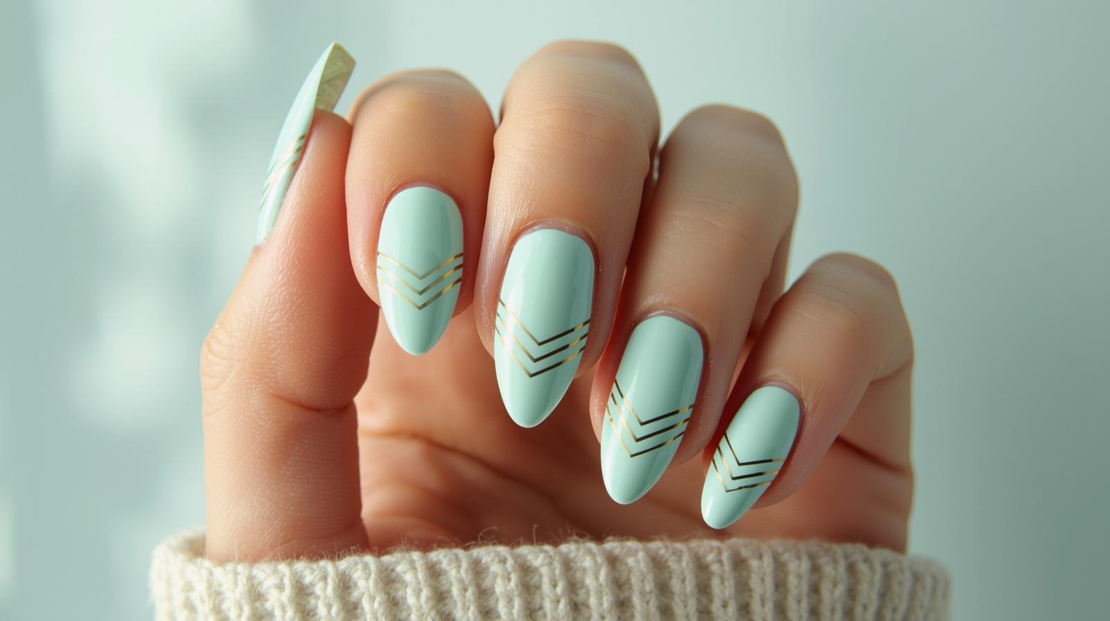 Clean geometric shapes in mint green against a white or nude background create a modern, fresh nail look that feels both trendy and minimal. Triangles, thin lines, or small squares are scattered across the nail for a design that’s graphic without being loud. Perfect for the minimalist who still wants something interesting on her nails.
