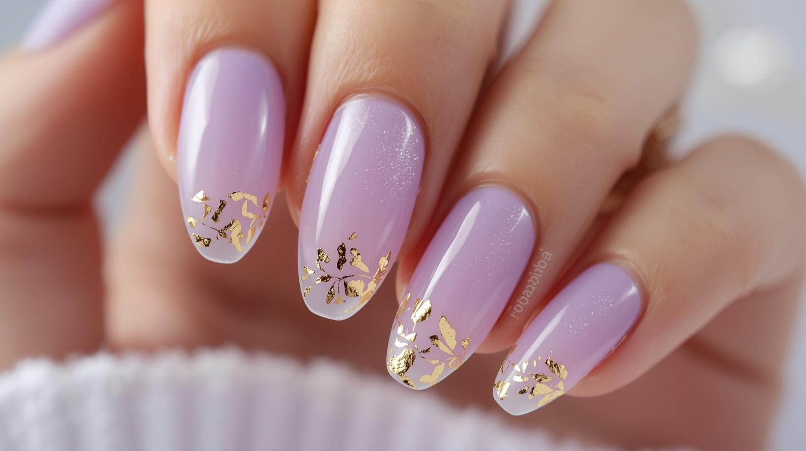 A sheer, wispy lilac base scattered with random gold foil flakes looks expensive, effortless, and completely unique every single time. Because the foil placement is random, no two nails ever look exactly the same — which makes this design feel spontaneous and handcrafted. This is one of those pastel spring nail ideas that works just as well at home as it does in a salon.