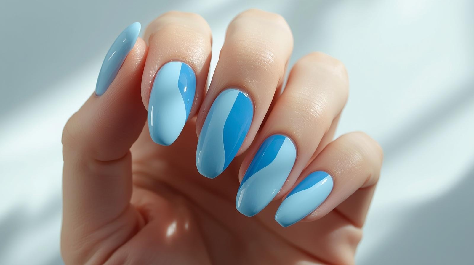 • Step 2: Use nail tape or a steady hand to paint half-moon shapes, diagonal blocks, or organic patches in sky blue on each nail.