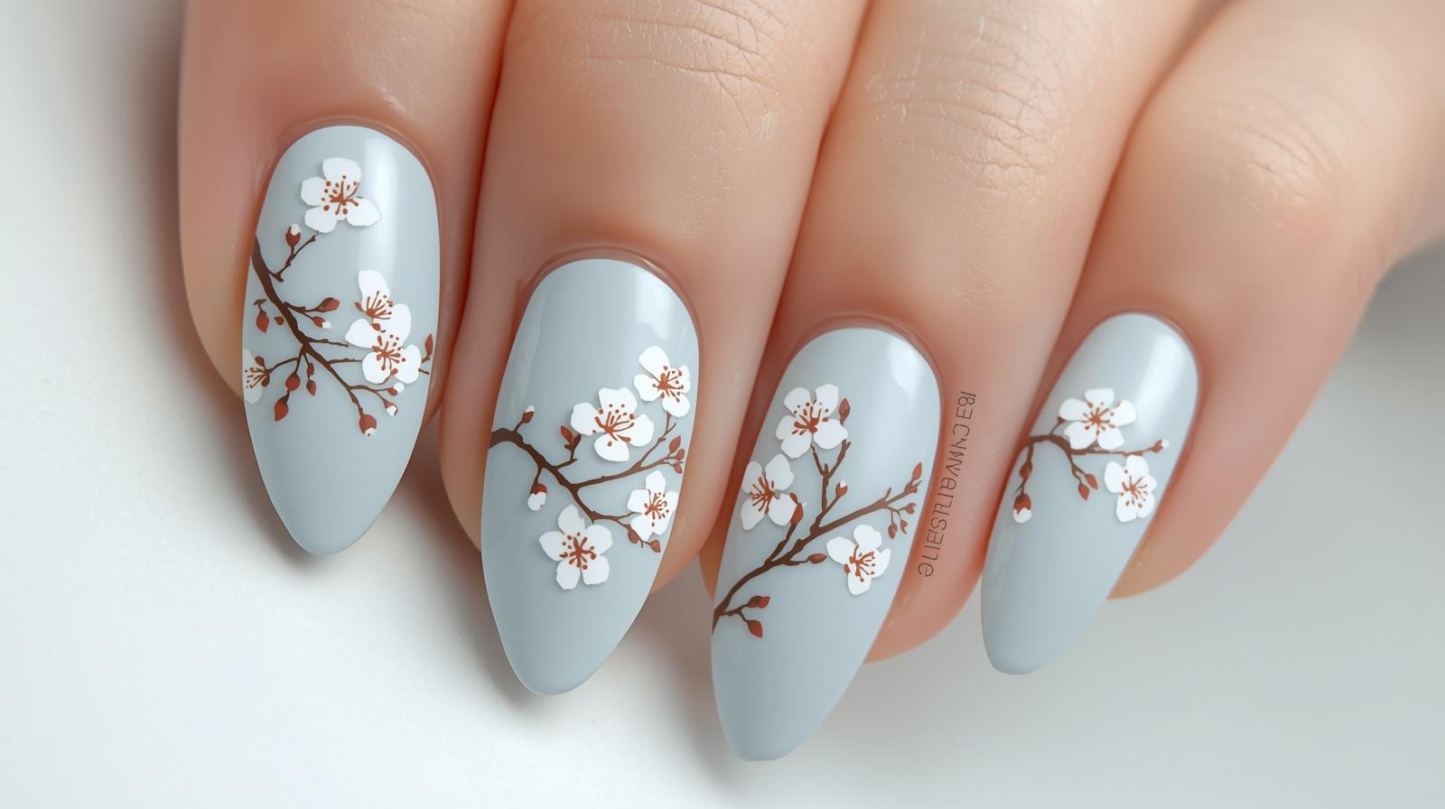 A powder blue base with delicate white cherry blossoms hand-painted on an accent nail — this design is pure spring romance. The small, five-petal flowers with pink centers against the cool blue background feel like a wearable piece of Japanese art. It’s detailed but not overwhelming, making it ideal for all occasions.