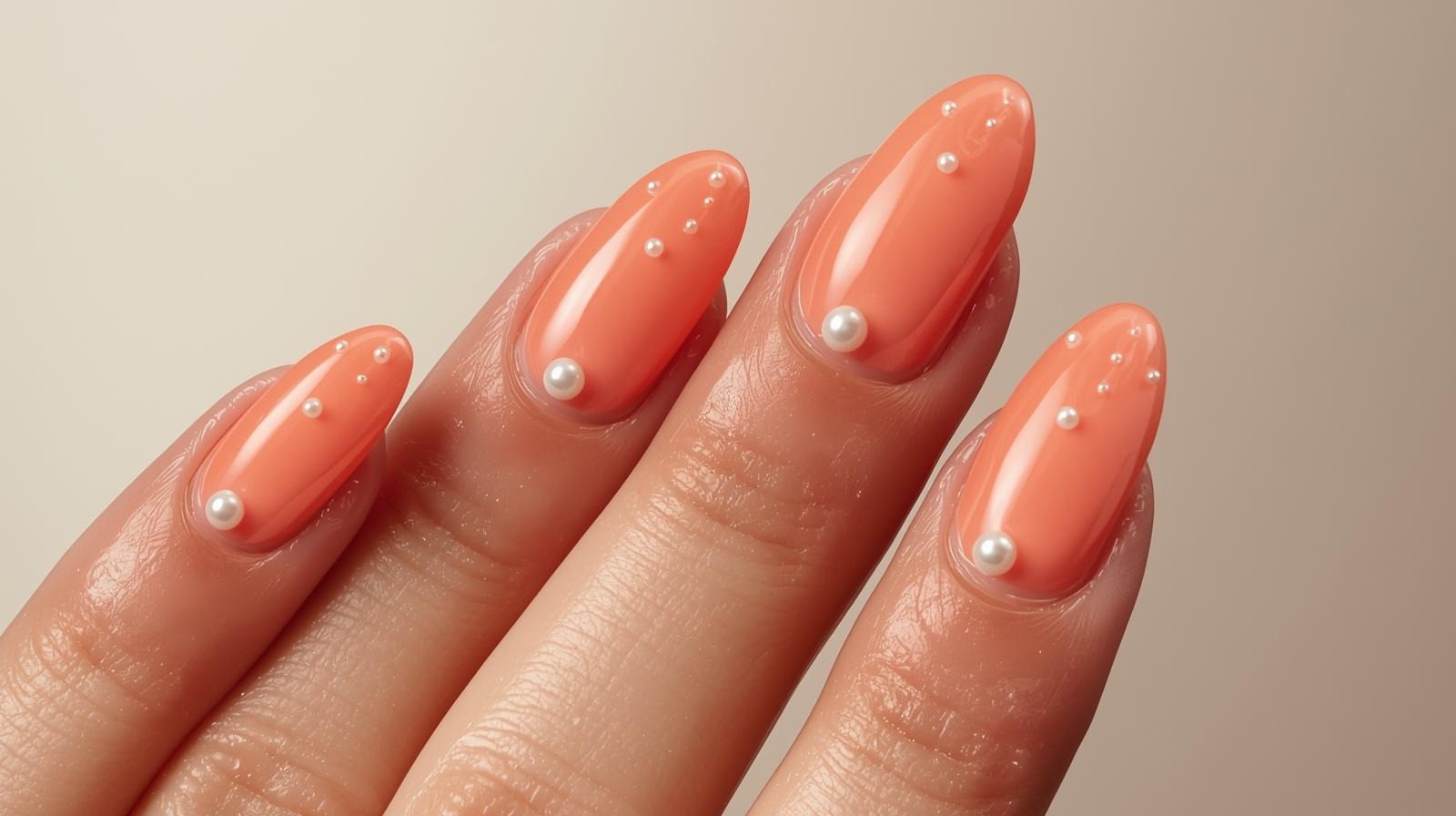 Soft coral — sitting right between pink and peach — is one of the most flattering pastel shades for spring 2026. Adding tiny 3D pearl beads or nail sticker pearls along the cuticle edge or in a diagonal line elevates this look to full luxury status. The combination of soft color and pearl texture is incredibly elegant.