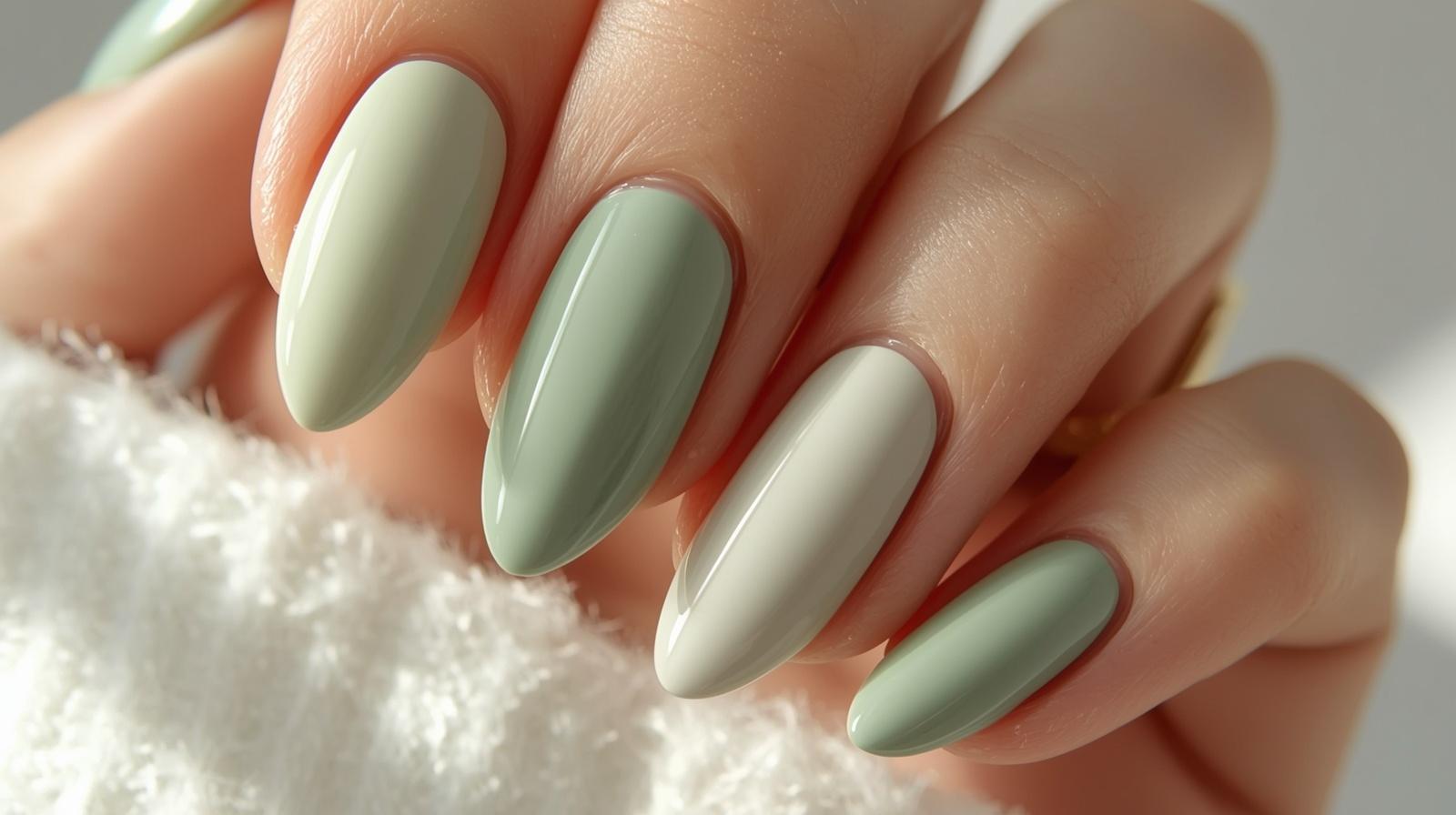 • Step 2: Layer two coats of a dusty sage green polish, building even color coverage.