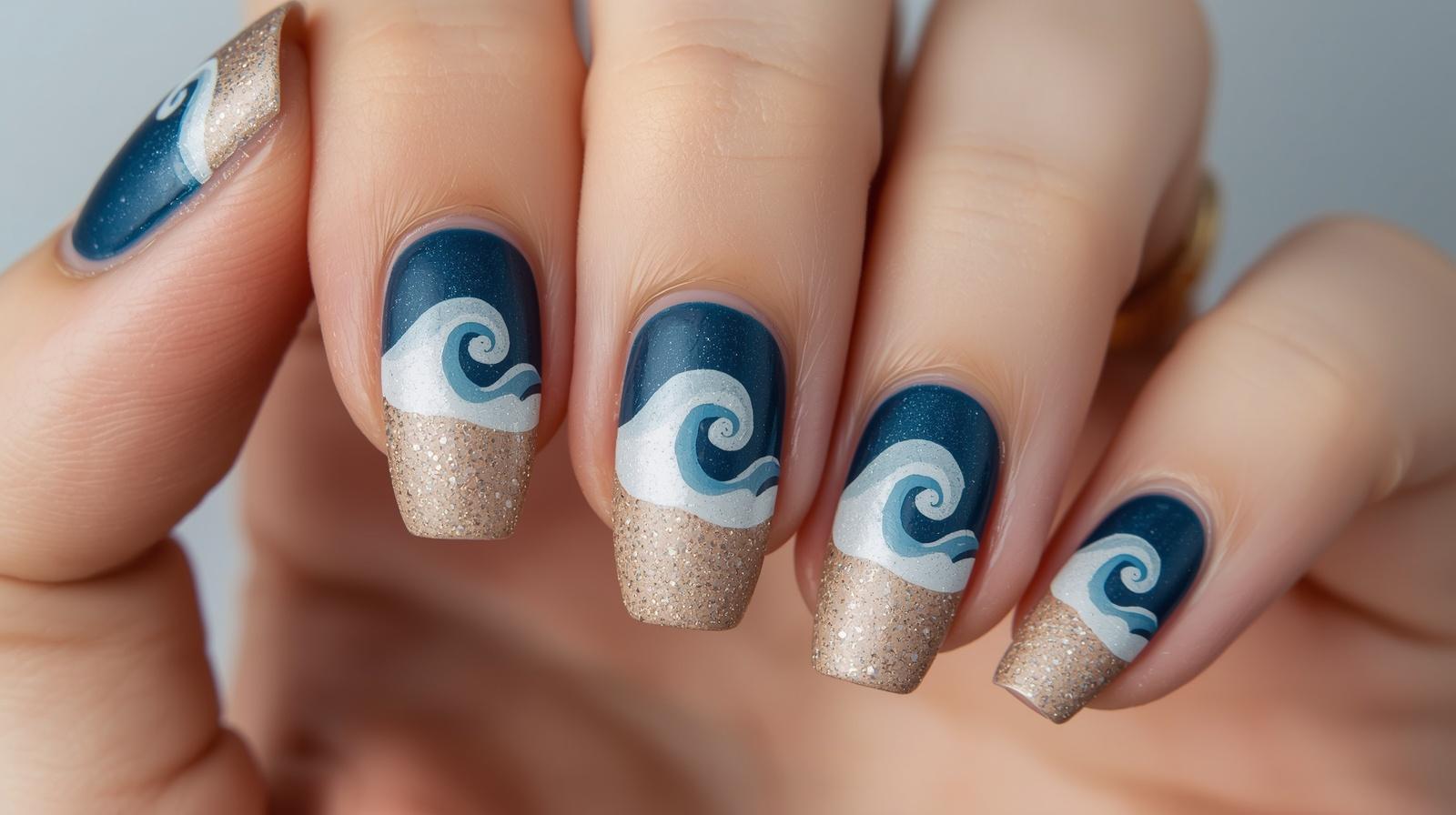A gradient that moves from a deep aquamarine at the nail base through turquoise and into a foamy white at the tip mimics the exact color transition of an ocean wave breaking on shore. It’s one of the most visually arresting nail design ideas for spring break 2026 — deeply specific to the beach setting and genuinely beautiful in a way that a single solid color can’t replicate. Wear it on medium almond or coffin nails for maximum wave effect.