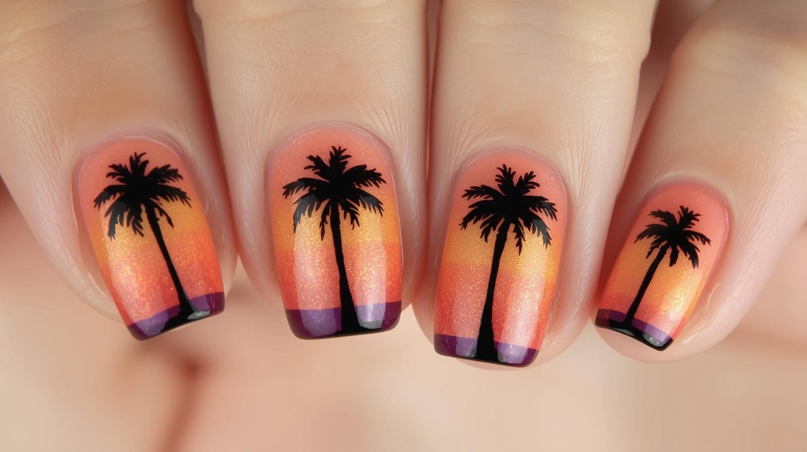 - Step 2: Once the ombre base is fully dry, use a very fine liner brush loaded with black polish to paint a palm tree silhouette — a curved thin trunk from the base upward, with frond shapes fanning out from the top.
