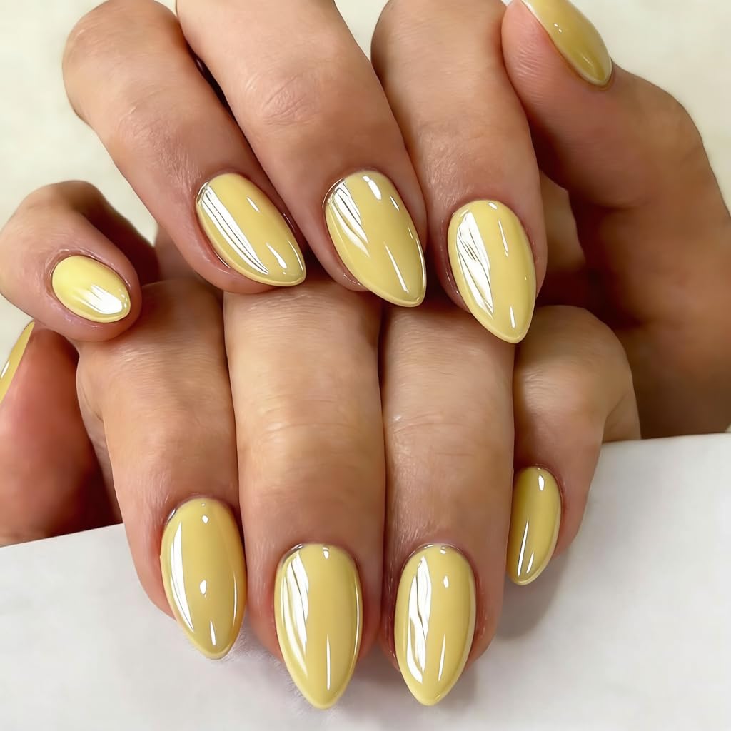 Bright yellow nail design base with tiny hand-drawn pineapples on each nail or just the accent. Add gold glitter top coat over the pineapple for a luxe tropical feel. Pairs perfectly with a tan.